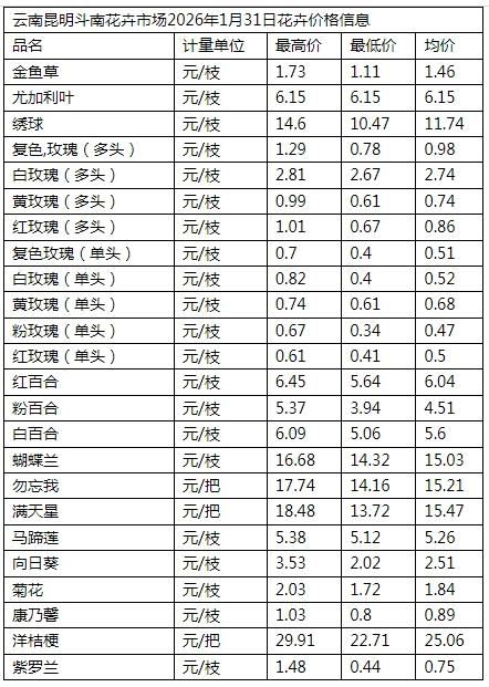 云南昆明斗南花卉市场2026年1月31日花卉价格信息