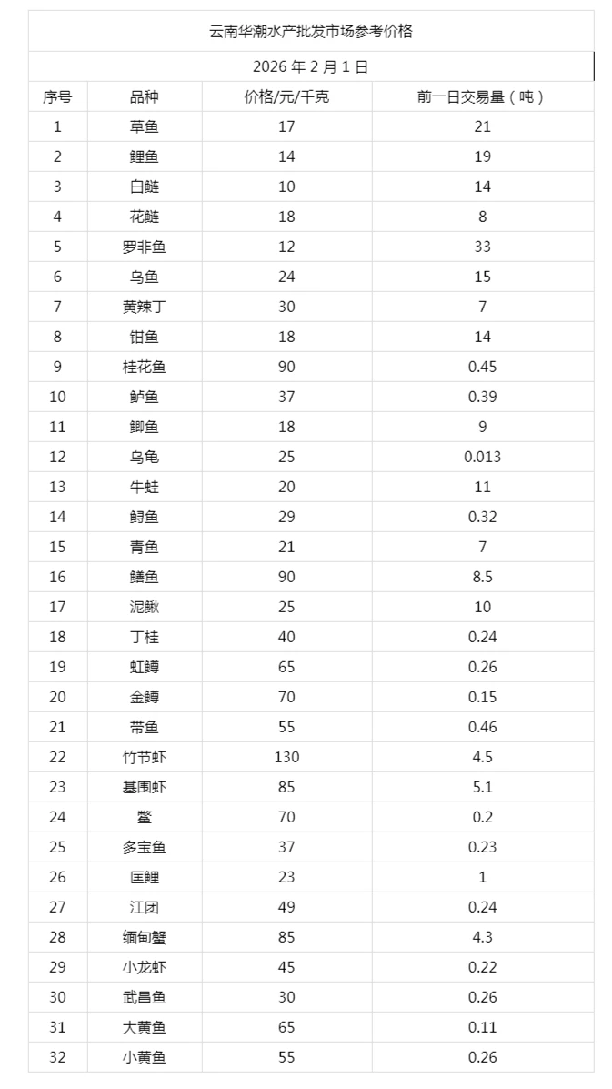 云南华潮水产批发市场2026年2月1日参考价格