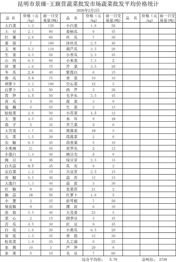 昆明市景臻-王旗营蔬菜批发市场2026年2月2日蔬菜批发平均价格统计