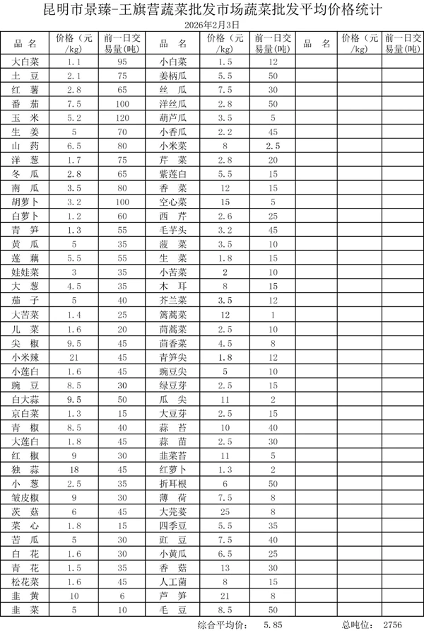 昆明市景臻-王旗营蔬菜批发市场2026年2月3日蔬菜批发平均价格统计
