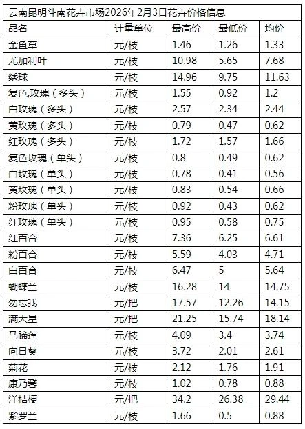 云南昆明斗南花卉市场2026年2月3日花卉价格信息