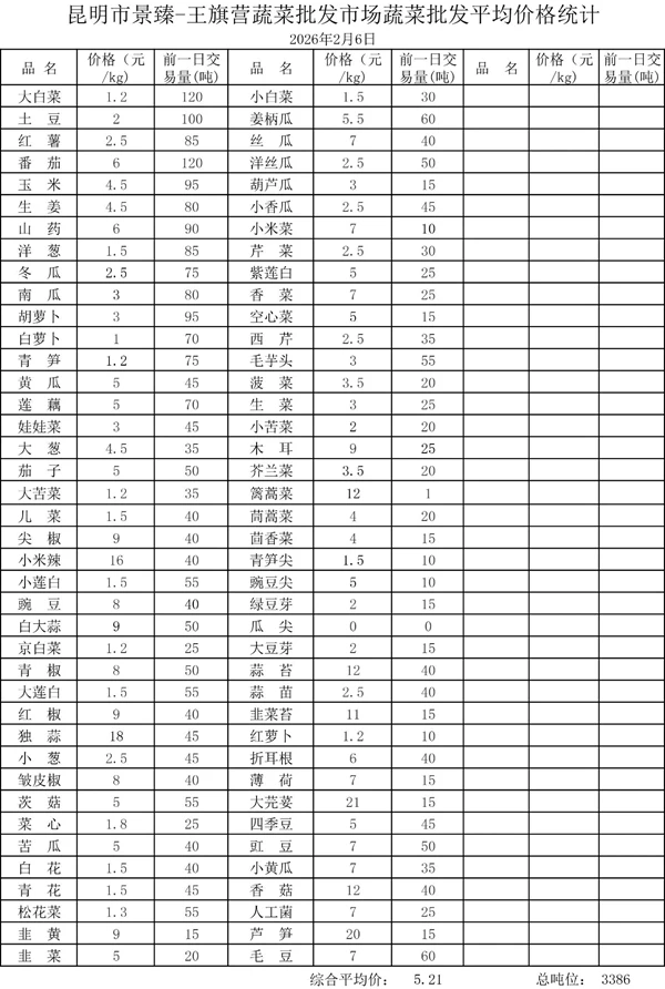 昆明市景臻-王旗营蔬菜批发市场2026年2月6日蔬菜批发平均价格统计