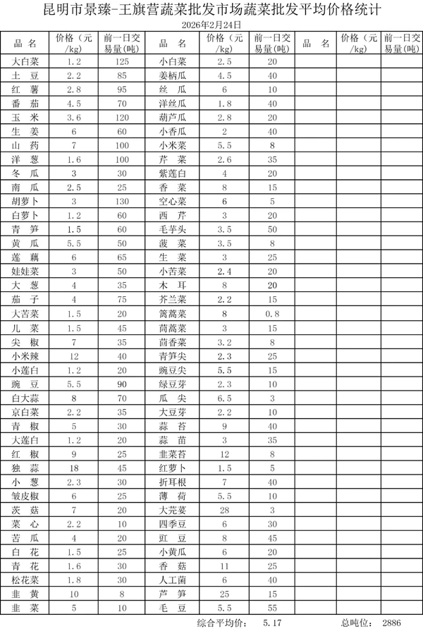 昆明市景臻-王旗营蔬菜批发市场2026年2月24日蔬菜批发平均价格统计