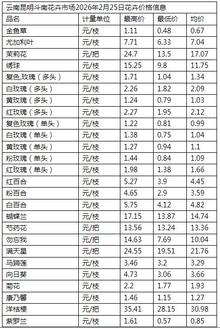 云南昆明斗南花卉市场2026年2月25日花卉价格信息