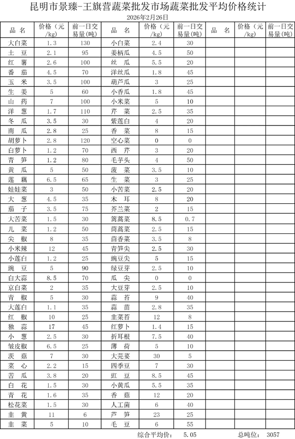 昆明市景臻-王旗营蔬菜批发市场2026年2月26日蔬菜批发平均价格统计