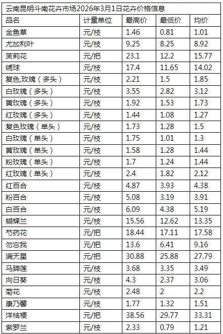 云南昆明斗南花卉市场2026年3月1日花卉价格信息