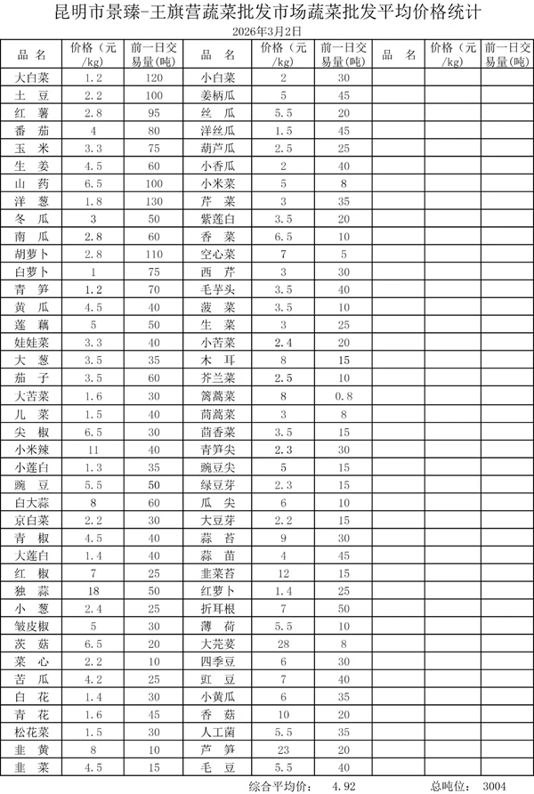 昆明市景臻-王旗营蔬菜批发市场2026年3月2日蔬菜批发平均价格统计