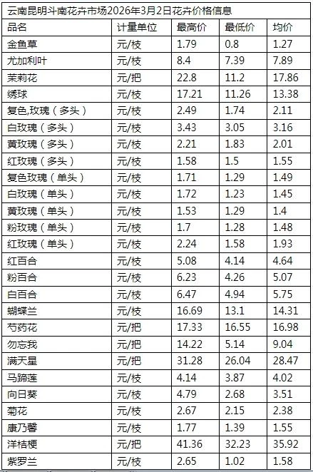 云南昆明斗南花卉市场2026年3月2日花卉价格信息