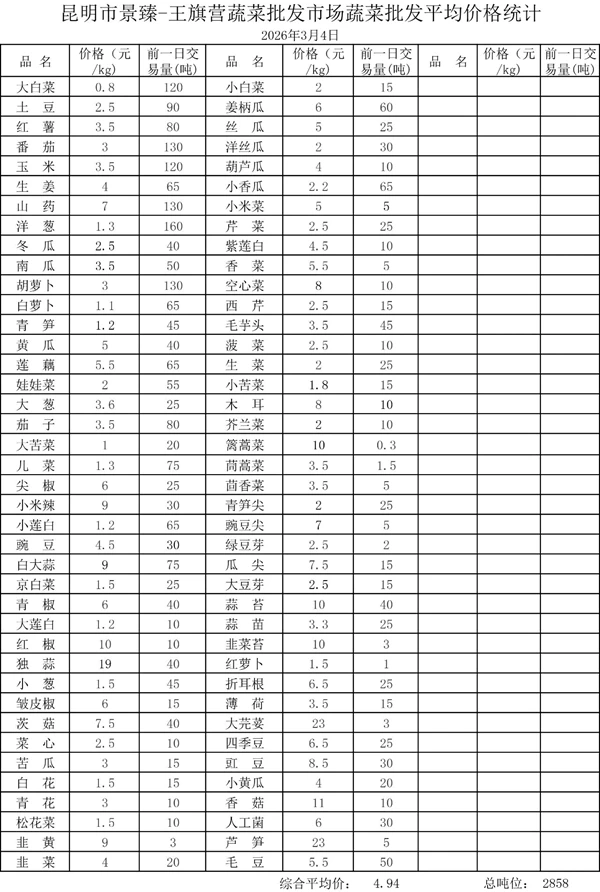 昆明市景臻-王旗营蔬菜批发市场2026年3月4日蔬菜批发平均价格统计