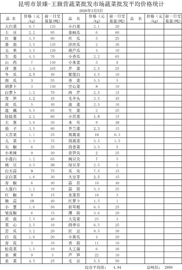昆明市景臻-王旗营蔬菜批发市场2026年3月5日蔬菜批发平均价格统计