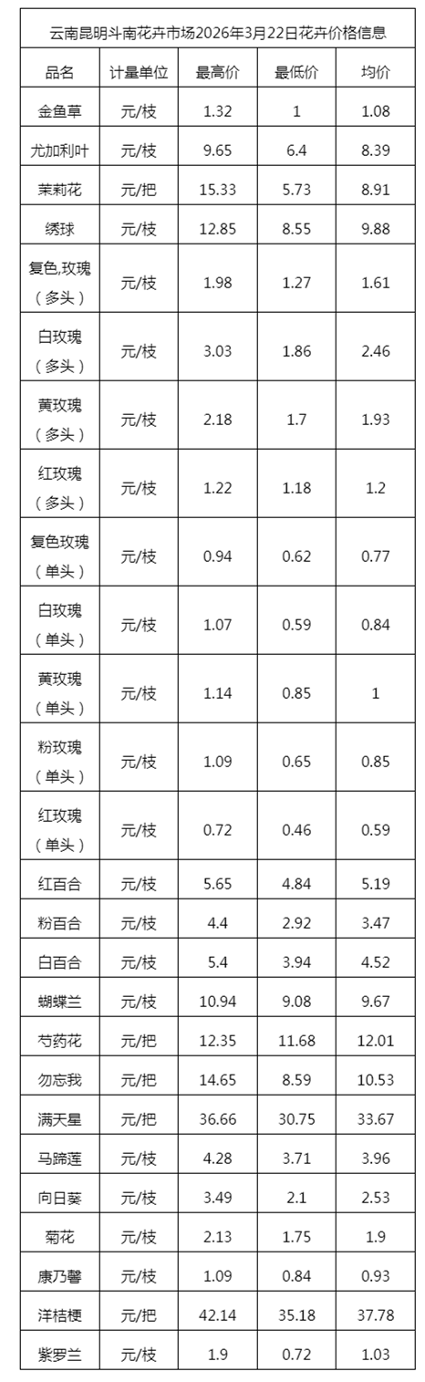 云南昆明斗南花卉市场2026年3月22日花卉价格信息