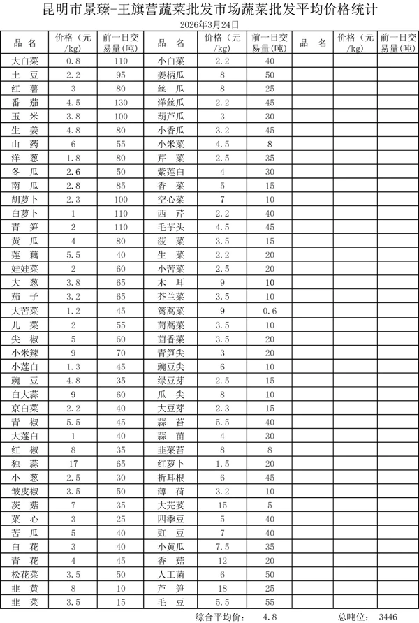 昆明市景臻-王旗营蔬菜批发市场2026年3月24日蔬菜批发平均价格统计