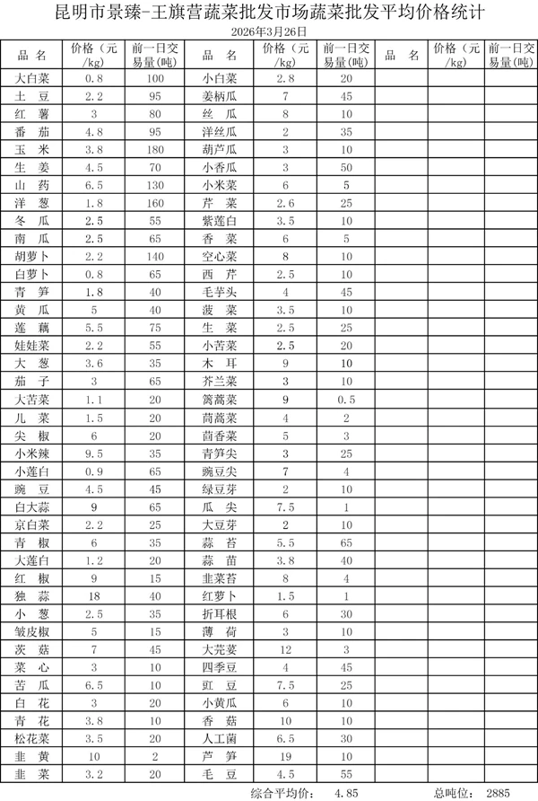 昆明市景臻-王旗营蔬菜批发市场2026年3月26日蔬菜批发平均价格统计
