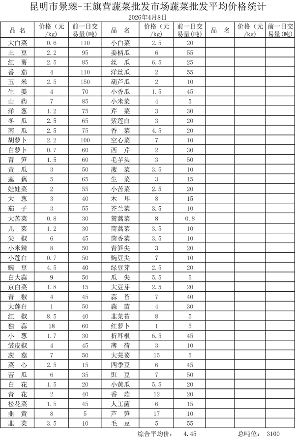 昆明市景臻-王旗营蔬菜批发市场2026年4月8日蔬菜批发平均价格统计