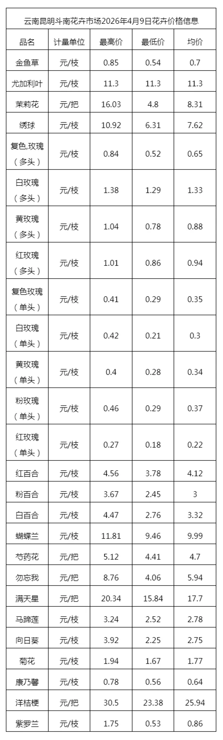 云南昆明斗南花卉市场2026年4月9日花卉价格信息
