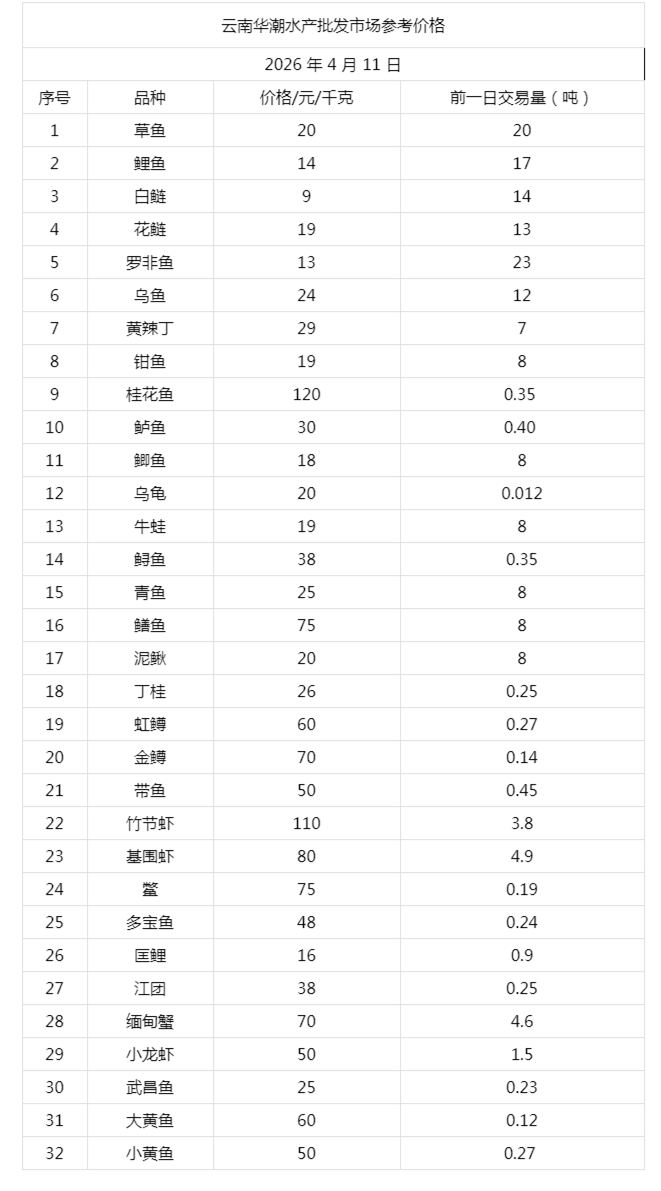 云南华潮水产批发市场2026年4月11日参考价格