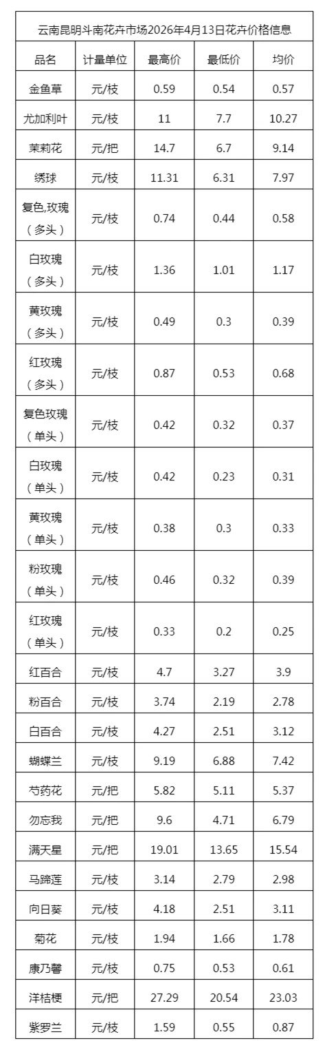 云南昆明斗南花卉市场2026年4月13日花卉价格信息