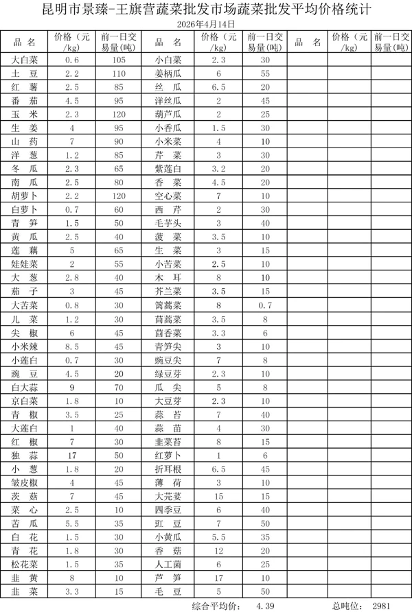 昆明市景臻-王旗营蔬菜批发市场2026年4月14日蔬菜批发平均价格统计