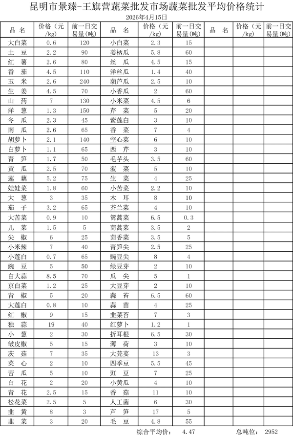 昆明市景臻-王旗营蔬菜批发市场2026年4月15日蔬菜批发平均价格统计