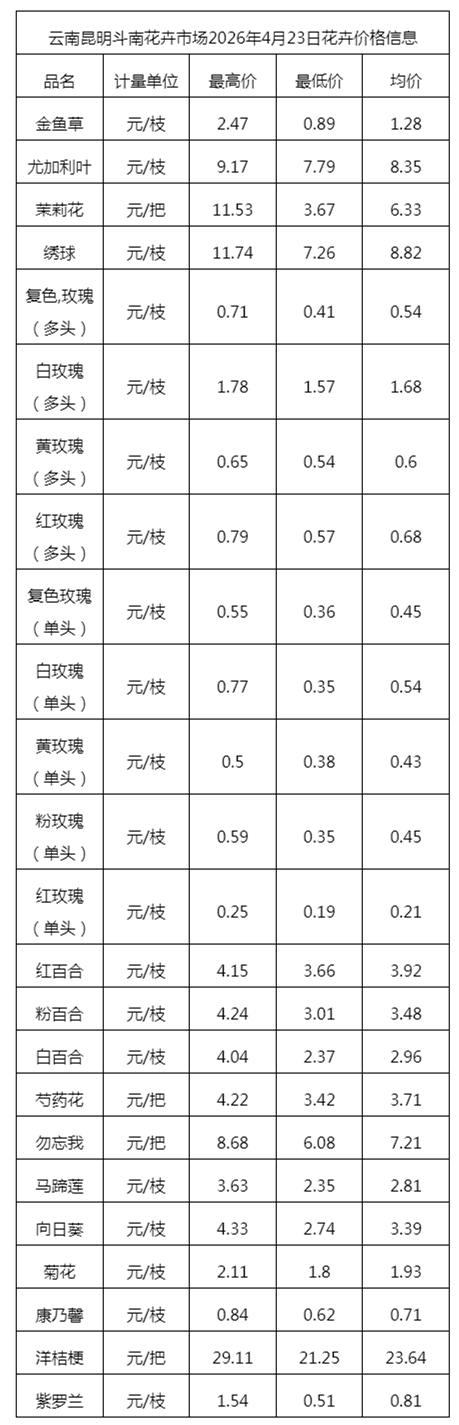 云南昆明斗南花卉市场2026年4月23日花卉价格信息