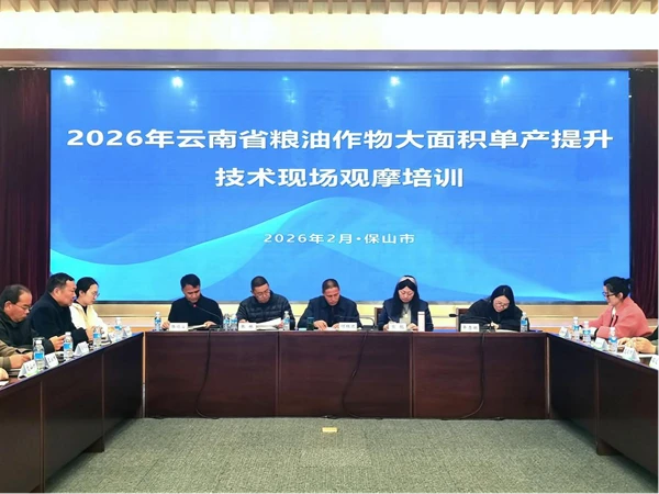 为全面落实粮油作物大面积单产提升技术措施,扎实推动2026年粮油作物大面积单产提升取得实际成效,2月5日,云南省农业技术推广总站在保山市举办粮油作物大面积单产提升技术现场观摩培训。云南省农业农村厅种植业管理处(农药管理处)负责人,云南省种子管理站、云南省土壤肥料工作站、云南省植保植检站(省农药检定所)、云南省农业机械推广站、云南省气候中心、云南大学农学院专家,全省16个州(市)农业技术推广中心(农科院、推广站、农科所)主要负责人、54个粮油糖桑作物大面积单产提升行动任务县农技推广中心负责人等共120余人参加培训。