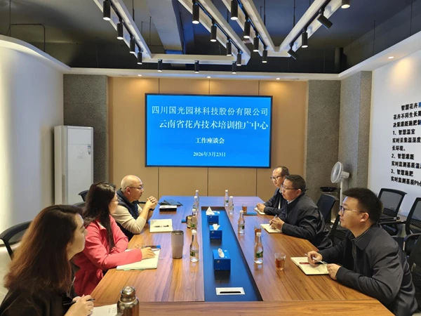 3月23日,四川国光园林科技股份有限公司一行到云南省花卉技术培训推广中心开展座谈交流,该公司隶属国内知名农化上市企业四川国光股份有限公司,拥有完善的作物生理调控、绿色植保、高效种植研发体系与成熟的产业落地经验。会上,双方围绕蓝莓全产业链健康持续发展主题,重点针对生根促壮、催花促果、膨果增甜等关键应用技术,展开细致研讨与经验分享,结合云南本地蓝莓种植的气候特点、种植模式与产业现状,梳理技术优化方向与落地思路。同时双方就共同推进蓝莓产业食品安全管控、环境友好型种植、水肥回水循环利用、农产品商品溯源体系建设、优质品牌打造惠民、产业良性示范推广,以及关键技术产学研推一体化融合发展等多项重点工作开展交流,最终,双方达成初步合作意向。(拟稿人/摄影:周银龙 审核人:陈锐)