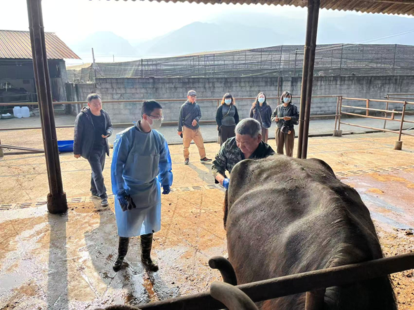 活动中,技术工作小队首先抵达盈江县,重点选取了一家规模化奶水牛养殖场作为示范点,集中推广与示范了母牛同期发情这一实用技术。张继才在现场面向十五名基层技术人员,系统而详实地讲解并演示了采用CIDR(阴道栓)结合PG(前列腺素)法的同期发情技术原理与操作流程,同时讲授了母牛妊娠检查的实践技巧与要点和母牛繁殖障碍综合症的防治方法。随后,在现场指导技术人员对39头奶水牛母牛进行了妊娠检查,并为14头已确认空怀的母牛放置了阴道栓以调整其发情周期,并运用穿刺技术当场治疗了一例患有卵泡囊肿的母牛。