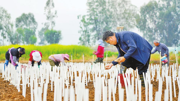 基地同步推进人工育秧与机械化育秧。在人工育秧现场,工作人员分工协作、配合默契。细致平整苗床、梳理畦面后,工作人员手持种子均匀撒播,并为播种后的苗床覆盖薄膜,做好保温防护工作。机械化育秧通过自动化流水线完成铺土、精播、覆土等作业,缩短育秧周期、培育齐壮秧苗,大幅降低人工成本,提升育秧质效。