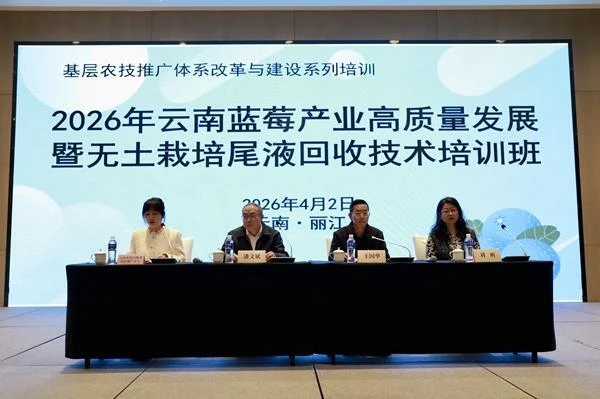 4月1日至4月3日,由云南省花卉技术培训推广中心、丽江市农业农村局主办的“基层农技推广体系改革与建设系列培训——2026年云南蓝莓产业高质量发展暨无土栽培尾液回收技术培训班”在丽江市玉龙县成功举办。本次培训紧扣小浆果产业高质量发展与绿色生产需求,全力强化全省小浆果产业基层农技推广人才队伍建设,丽江市及大理州各县(区)农技推广人员、蓝莓重点种植企业、种植户代表110余人参训。