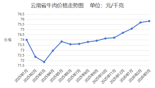 2.牛肉75.83元/千克,同比上涨5.54%,环比涨0.18%,每千克比全国均价72.14元高3.69元,高5.12%。