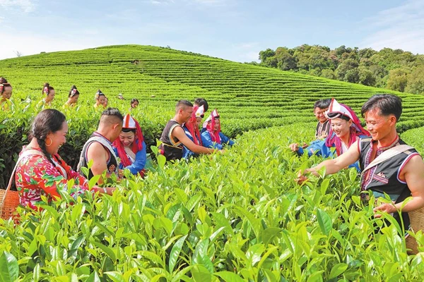 春雨润沃土,茶山焕生机。西双版纳傣族自治州景洪市勐旺乡的茶园里绿意盎然、茶香四溢。身着绚丽民族服饰的基诺族党员干部与群众一道,穿梭在层层叠叠的茶垄间,抢抓雨后农时采摘春茶。